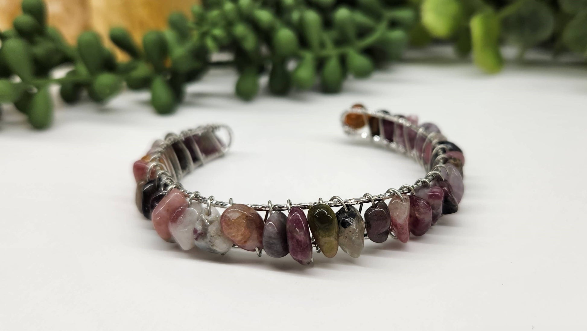 Watermelon Tourmaline beads wire wrapped to form this beautiful bangle/cuff/ bracelet.